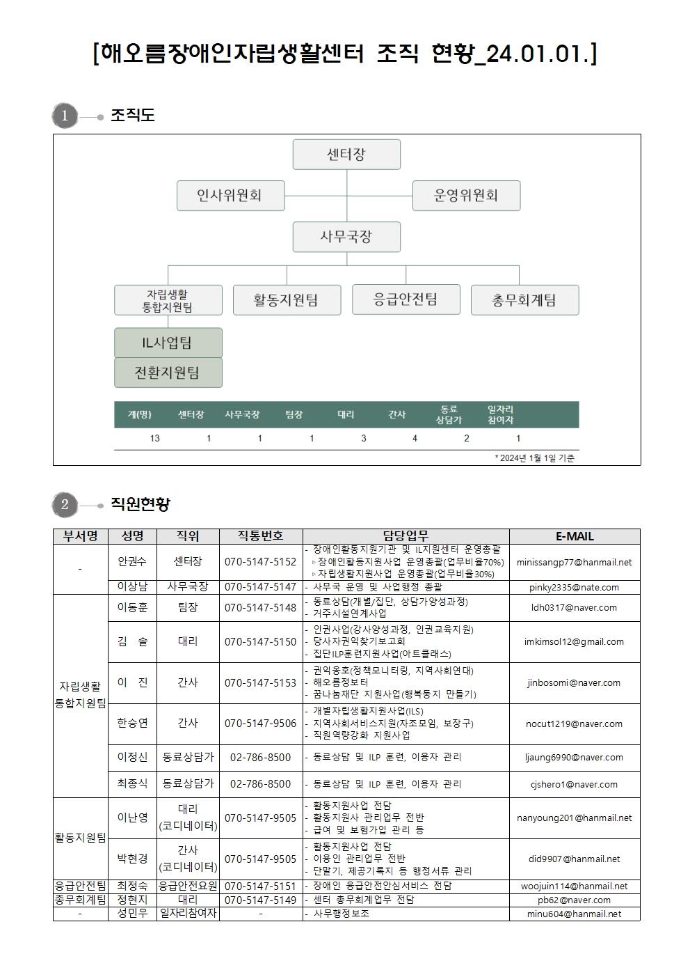 해오름장애인자립생활센터 사명 및 중장기 운영방향, 조직도 및 직원현황 (2024. 1. 1. update)