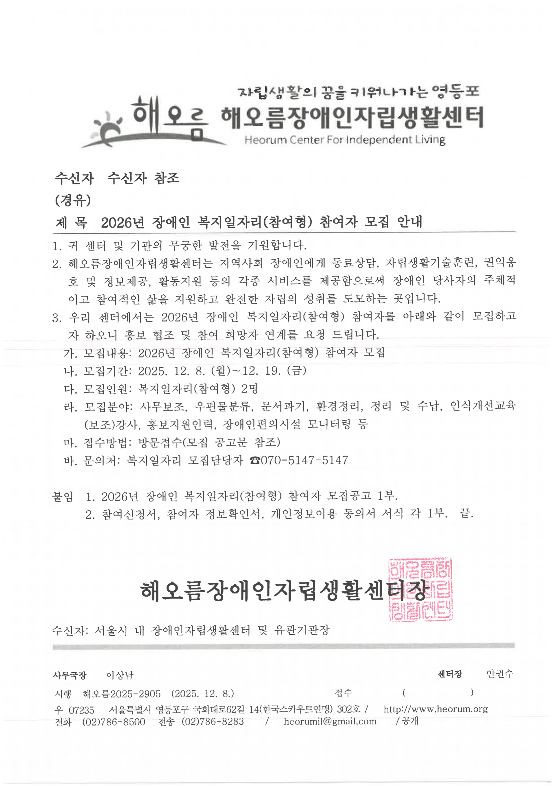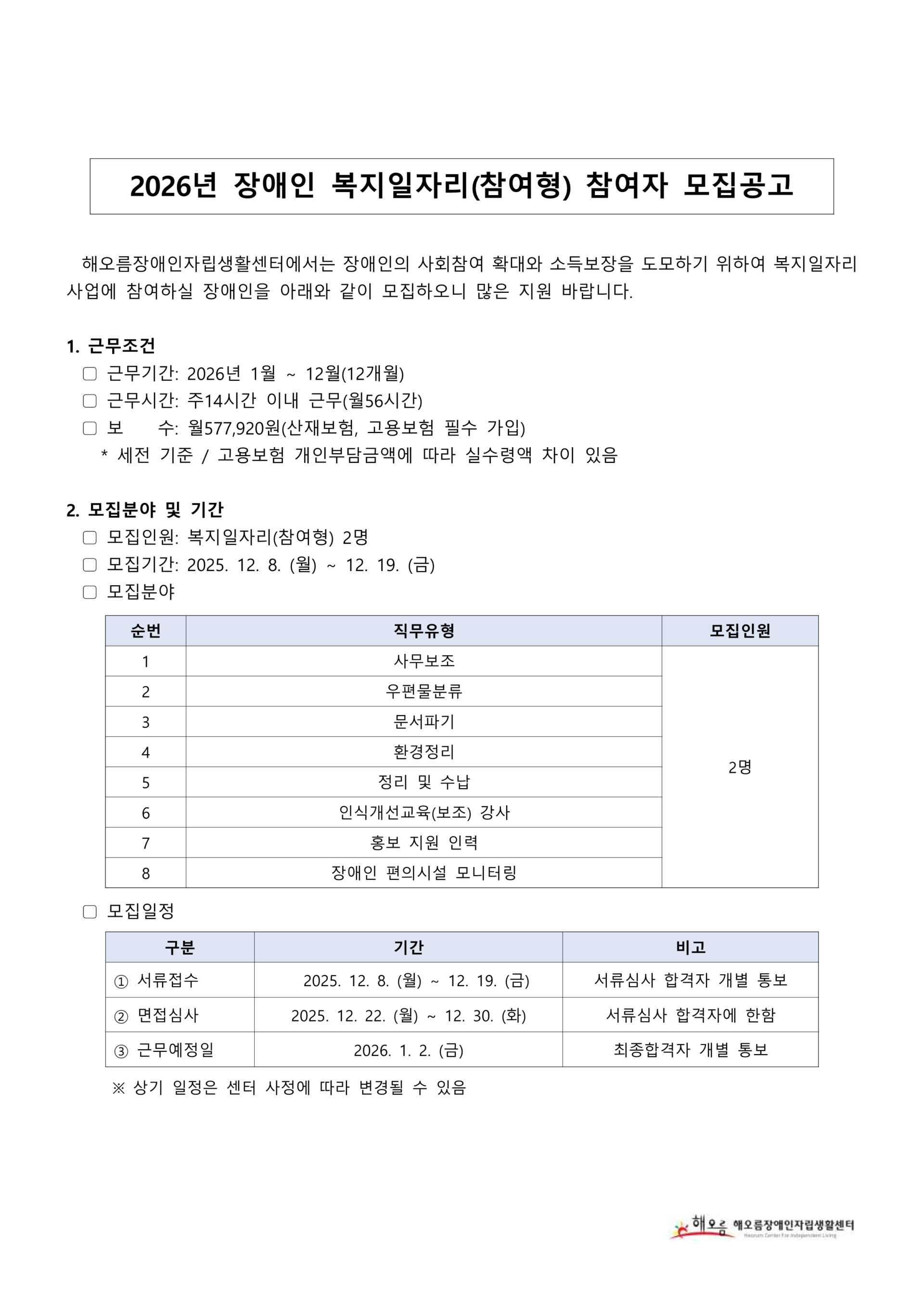 2026년 장애인 복지일자리(참여형) 참여자 모집 안내